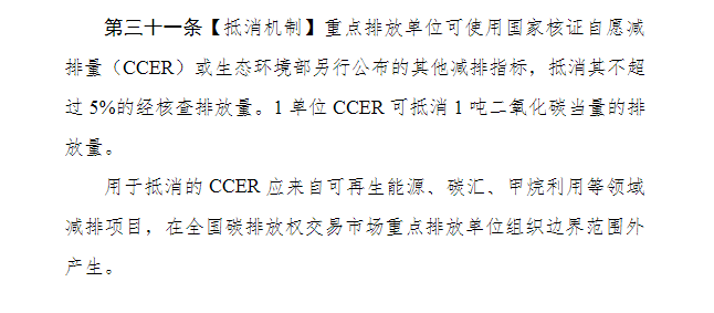 根據(jù)《全國(guó)碳排放權(quán)交易管理辦法》文中第31條【抵消機(jī)制】來(lái)看,可再生能源開發(fā)的CCER(國(guó)家核證自愿減排量)可以用來(lái)抵消5%的經(jīng)核查排放量。