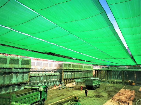從上方俯瞰,11000平方米的長方形綠色幕網像極了草坪足球場;下到基坑中向上看,整個基坑被綠帳包裹,巨大的綠色帷幔似層層海浪。
