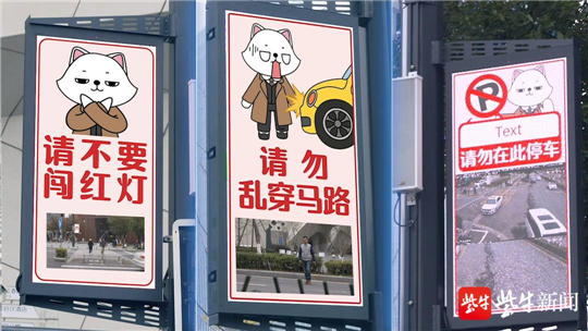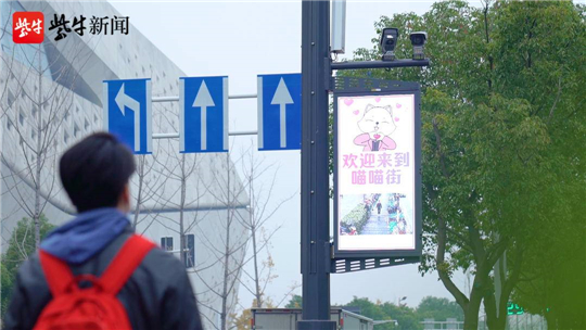“歡迎來(lái)到喵喵街?!碑?dāng)行人從金沙江西街與樂(lè)山路交會(huì)處進(jìn)入喵喵街,掛載于路燈上的信息屏便出現(xiàn)歡迎界面,音響開(kāi)始播放歡迎音效。